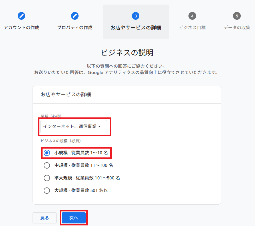 業種とビジネスの規模を設定するのですが、自分が今やろうとしていることをイメージして設定すれば問題ないです。
