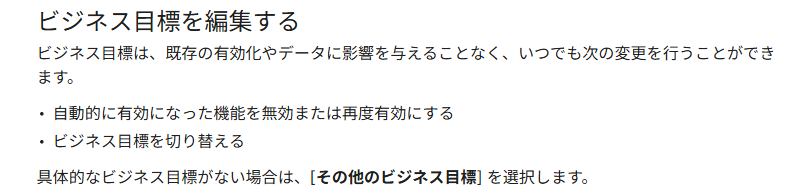 ここでの設定が初期レポート構成(GAのメニュー)に影響するようですが、具体的な目標がない場合は[その他のビジネス目標]を設定しておけばよいようです。ちなみに、構成要素は後から変更できるとのことです。