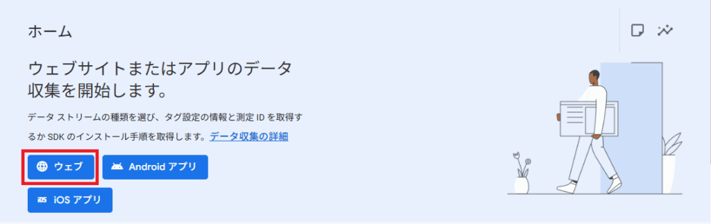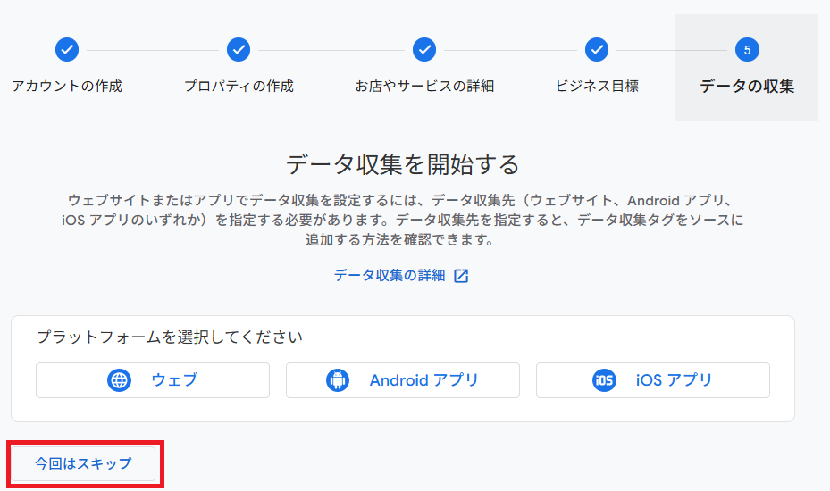 このままデータ収集設定までやると良いのですが、個人的な事情でデータ収集の設定は日を分けて実施にしたので、GAの初期設定としては一旦スキップしました(事実ベースw)。