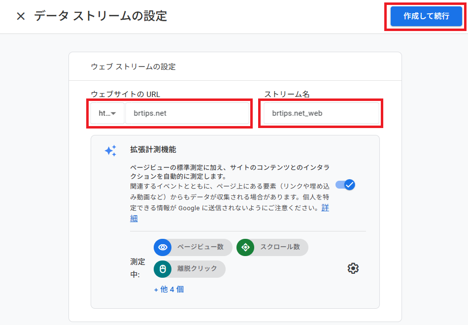 設定したら[作成して続行]をクリックします。
