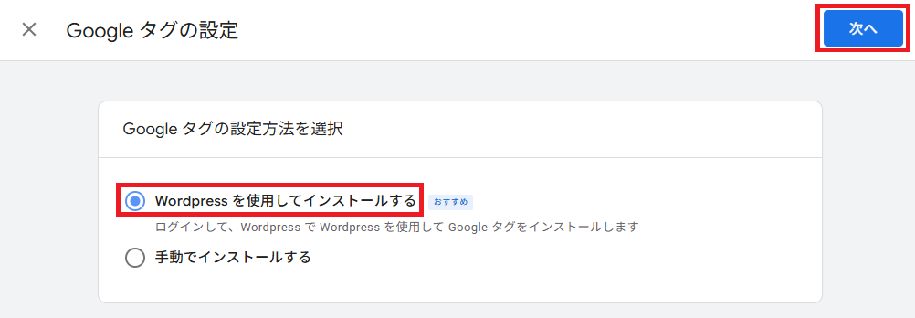 WordPressの場合は簡単にタグ設定できるようなので、このままWordPressを仕様してインストールで[次へ]をクリックします。