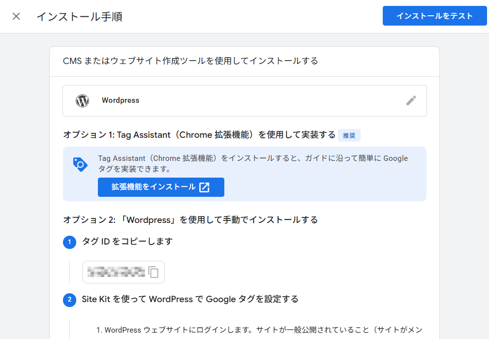 作成して続行をクリックして少し待つと、Googleタグ設定の画面が表示されます。