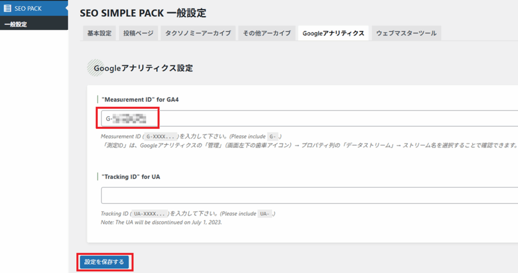 私はSWELLを利用している関係でSEO SIMPLE PACKをインストールしているので、SEO SIMPLE PACKにオプション2-①で表示されているGから始まるタグIDをコピーして設定する形ですね。