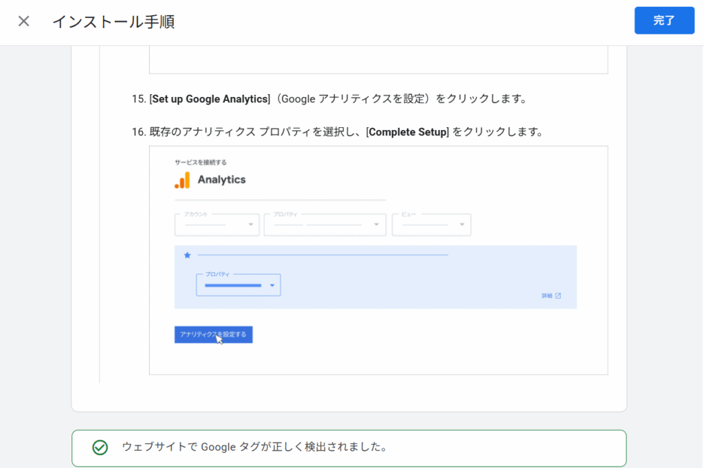 設定が完了したら、先ほどのインストール手順のページの右上[インストールをテスト]をクリックすると、設定状態が確認できます。問題なく設定できていれば、右上のボタンが[完了]になり、画面一番下に「ウェブサイトでGoogleタグが正しく検出されました」が表示されます。