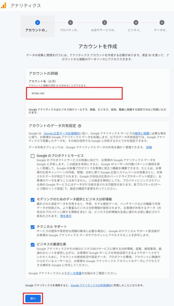 アカウント名を設定します。なんでもいいと思うので、私はサイト名にしました。