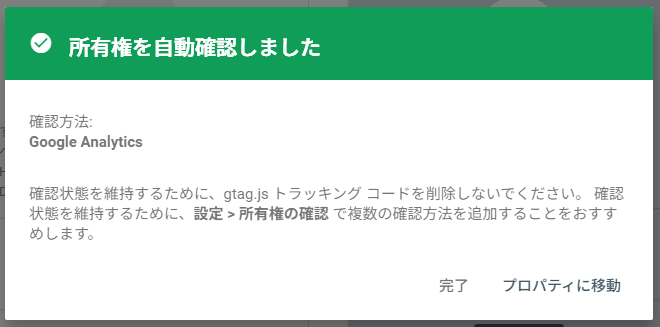 私の場合は同一のGoogleアカウントにGAを設定していたので、自動でGAから所有権が確認されました。