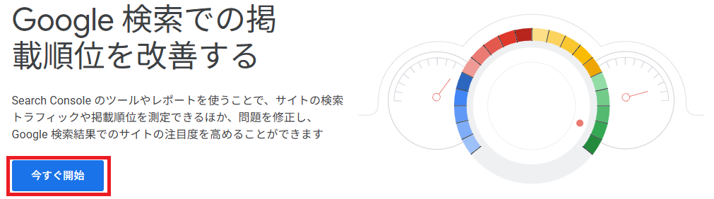 Googleにログインした状態でGoogle Search Consoleサイトにアクセスし、[今すぐを開始]を選択します。