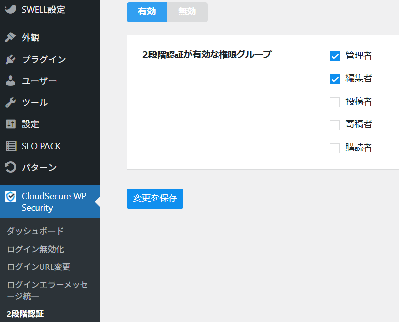 [CloudSecure WP Security]→[2段階認証]の画面を開き、二段階認証の対象をする権限グループを設定します。