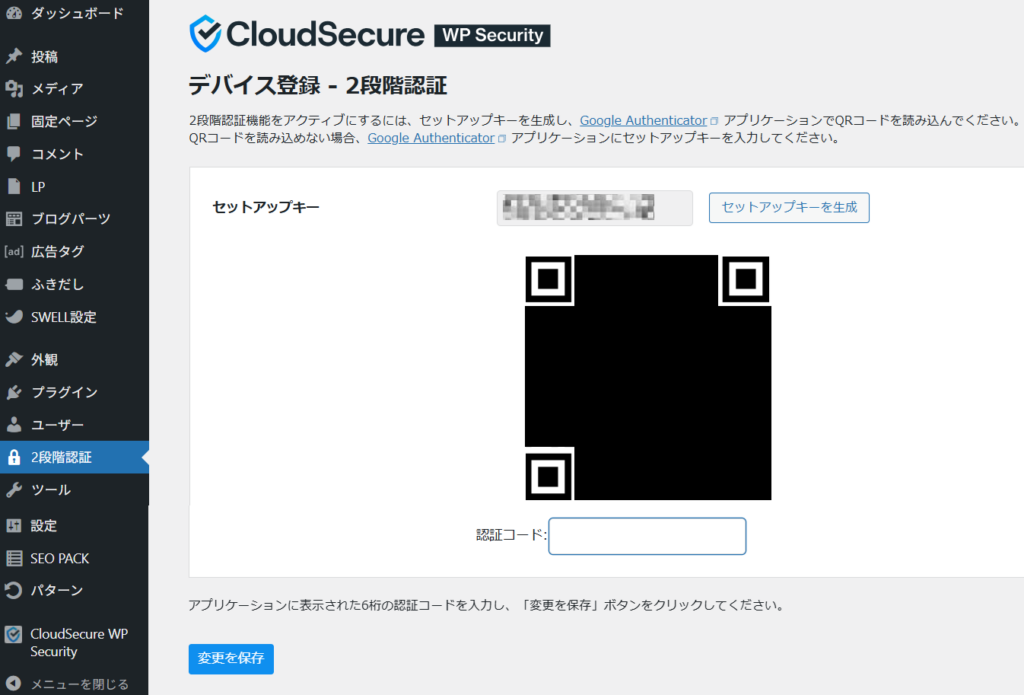 Google Authenticatorに表示された認証コードをWordpressのデバイス登録画面に設定して、