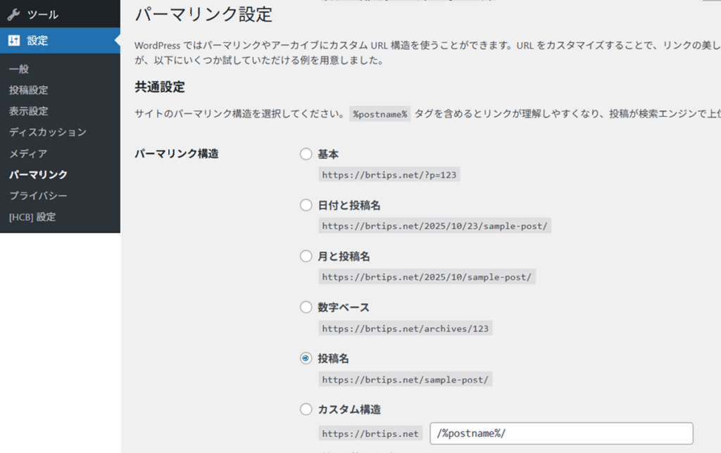 そのため、[設定]→[パーマリンク]でパーマリンク設定を「投稿名」に変更します。