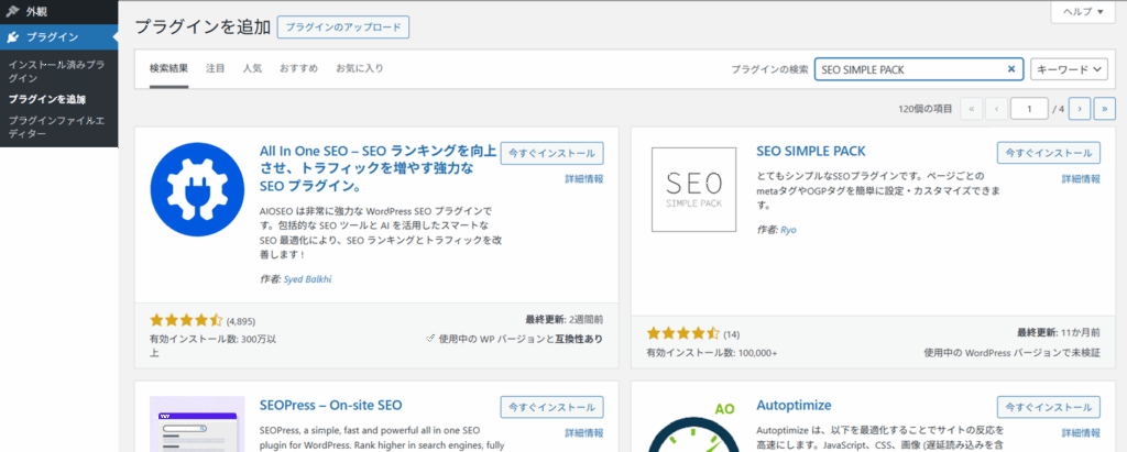 [プラグイン]→[プラグインを追加]→[SEO SIMPLE PACKを検索]→[今すぐインストールをクリック]です。